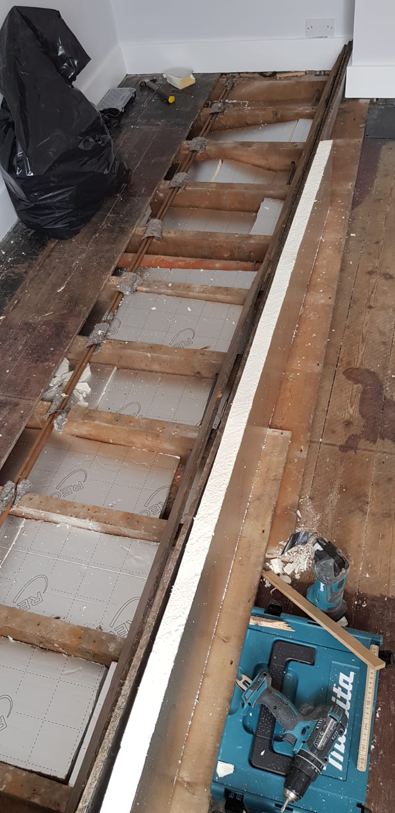 Each pine floorboard was carefully lifted but we only had to remove a third of the boards each side because we could slide the insulation through the middle to the other end – it was measured and cut each time for a good fit.